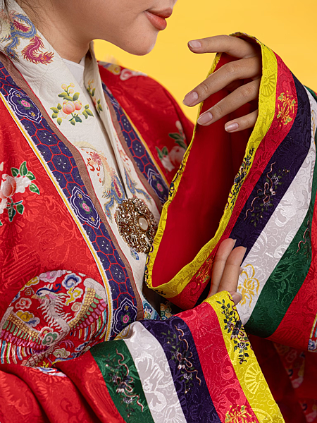 一平,是皇室公主和嬪妃的傳統宮廷服飾,象徵著優雅和高貴的美德。在皇家花園的靜謐片刻之後,宮殿恢復了莊嚴的儀式節奏。在熙熙攘攘的宗祠陰涼處,公主身著紅色的一平禮服出現,這件禮服象徵著古代皇室女性的優雅和美德。是越南阮朝時期的重要傳統服飾之一,主要為皇室女性穿著,因衣服前襟形狀像一個日字,因此得名。同時此種衣服的設計,也融合了越南民族風格與古代中華宮廷的元素,別具美感,也是阮朝公主和王后在宮中出席重要場合時才穿的服飾。